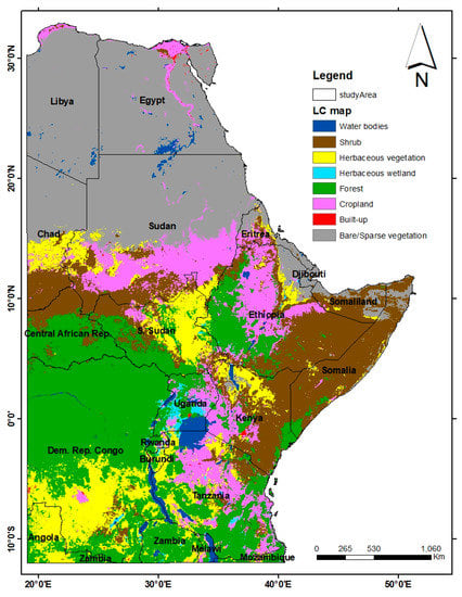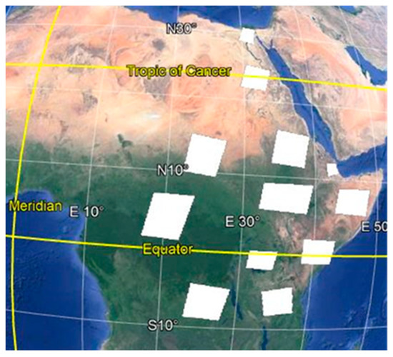 The study area, gray-shaded region, covers approximately 30% of the total area of the African continent (Figure 1). It is found between latitude, 11°58′31.71″ S, 33°0′18.55″ N, and longitude, 19°4′35.03″ E, 51°24′37.33″ E. It includes about 18 countries, fully or partially, that occur in the eastern, central, northeastern parts of Africa. The region is characterized by three main climates such as arid, Sahelian, tropical, and equatorial; where the northern part is mostly arid that includes the Sahara, the world’s largest desert, and central Africa is known for its tropical rain forest cover.