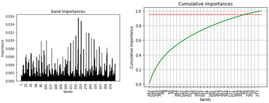 In the automatic method, we used the variable importance module of random forest in sklearn library (python 3.8) on OYSI consisted of 396 features/bands to select the most import variables; consequently, we obtained 337 features/bands using 95% cumulative importance. Analyzing the selected 337 bands resulted in almost the same accuracy and kappa score, 0.85 and 0.82, respectively, as OYSI which justified the redundancy of data that do not add vital information. Implying the rest of the 59 bands are the least important features and their effect on the overall result is insignificant.