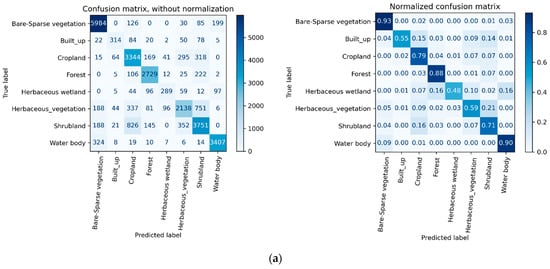 Figure 7 shows water bodies and bare/sparse vegetation are the most accurately classified classes, above 0.9, and little variations in recall and f1-score for all types of input data. These indicate that the classes have distinct spectral properties that are affected only slightly by the change in the number of months/temporal data processed; seasonal variation has little impact on them. On the other hand, the accuracy (user’s, producers, and f1-score) of four vegetation classes such as cropland, herbaceous wetland, herbaceous vegetation, and shrub improves by at least by 1% with increasing the number of months/temporal data, implying the significant impact of phenological event variation in surface cover type. Built-up area, however, showed no pattern with changes in the number of months as it is independent of seasonal variation. Moreover, it was classified with the least classification accuracy barely above 60%; and it is highly confused with cropland. This could be caused by the mixed pixels as the two classes are spatially associated and found mixed in most cases. Mixed pixel is one of the main factors that affect land cover accuracy when coarse resolution imageries are used [2]. The other reason could be its size. Since it is a minority class, found covering a small area, it is difficult to collect a large amount of reference data. Similarly, herbaceous wetland and herbaceous vegetation were mapped with less accuracy. The former is due to its size, being a minority class, and exhibiting similar spectral properties with water body, cropland, and forest; and/or they have mixed pixels of these classes. As a result, it was often mislabeled to these classes. Regarding herbaceous vegetation, it was mostly misclassified as shrub and cropland. In addition to the reasons mentioned above, that could be attributed to class/legend definition. That is, herbaceous vegetation can contain up to 10% trees and/or shrubs by definition, so it is highly likely to misclassify mixed classes where one of the classes is dominant and the other is close to the cut-off value. For instance, land covered by 87% herbaceous vegetation and 13% trees/shrubs may be misinterpreted as herbaceous vegetation while collecting data as the method of gathering information is a visual inspection which is prone to error that ultimately leads to confusion and misclassification. This could also be the main reason for the misclassification of shrubs as forest and vise verse. The impact of land cover class definition on accuracy has also been reported by [7].