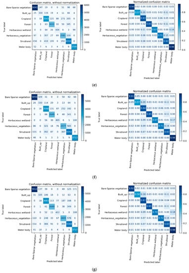 The performance of all seven input datasets composed of the different number of stacked imageries consisted of 3 to 36 composite images, where each of them containing 11 bands including NDVI was evaluated with the same independent test sample. However, the number of reference data, training, and test pixels, collected for the various classes vary according to the size of the land cover. That is, land cover types with larger areal coverage, e.g., Bare/Sparse vegetation, cropland, shrub, and forest were represented by a large number of pixels; while minority classes, such as built-up and herbaceous wetland were represented by fewer pixels in proportion with the prevalence of the class (see Figure 7 and Table 4). The strategy proved to yield the best accuracy [38].