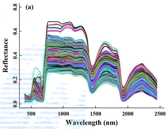 A composite dataset consisting of simultaneous leaf photosynthetic CO2 response measurements and reflectance spectra was built up for leaf samples taken during the period from May to October on Mount Naeba (36°51′ N and 138°40′ E, adjacent to the Sea of Japan). This mountain has typical cold–temperate deciduous forests from elevations of 550 to 1600 m [60]. Leaf sampling was carried out consistently using the detached branch method [61] from 2007 to 2015, except for 2011, on different layers of Fagus crenata Blume canopies, the only dominant species in the 4 permanent tower sites deployed along these altitudes, with one site at 550 m, two sites at 900 m (denoted 900 m X1 and 900 m X5), and another site at 1500 m. The photosynthetic parameters Vcmax and Jmax were estimated from the leaf photosynthetic CO2 response (A-Ci) curves at the saturating irradiance level, which was measured using a LI-COR LI-6400 portable photosynthesis system equipped with standard leaf chambers [7]. The “plantecophys” package [62] in the R platform was used. The synchronic reflectance measurements were performed using a FieldSpec spectrometer (Analytical Spectral Devices Inc., Boulder, CO, USA) with a leaf clip, which operates in the 350–2500 nm spectral range [63]. The reflectance spectra data spanning 350–399 nm and 2451–2500 nm were excluded from the analyses in this study due to the substantial noise in the edge bands of the spectrum produced by both the immediate environment and the instrument itself. The reflectance spectra data and corresponding Vcmax and Jmax values in the dataset are presented in Figure 1.
