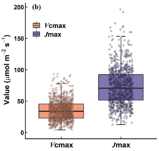 Leaf maximum carboxylation rate (Vcmax) and maximum electron transport rate (Jmax) are two key parameters describing leaf photosynthetic capacity which are essential to providing a mechanistic understanding of plant carbon fixation. Their parameterization determines the performance of carbon uptake simulations in terrestrial biosphere models [1,2,3]. Traditionally, the two parameters are obtained from in vivo measurements using gas exchange systems [4], which are not only time-consuming and labor-intensive but also consistently face scaling dilemmas because of their large variabilities across temporal and spatial scales [5,6,7,8]. Due to recent advances, hyperspectral remote sensing techniques can increasingly provide opportunities to rapidly measure leaf-level photosynthetic information using low-cost, nondestructive, and wide-scale monitoring, and they may help to enhance our understanding of photosynthetic capacity. Leaf hyperspectral reflectance contains many narrow and contiguous spectral channels, representing a collection of optical properties related to leaf biochemical characteristics and cell structure, as well as physiological properties. These properties have been used to estimate leaf photosynthetic capacity accurately [9,10] across different species, canopy environments, and leaf ages [11].