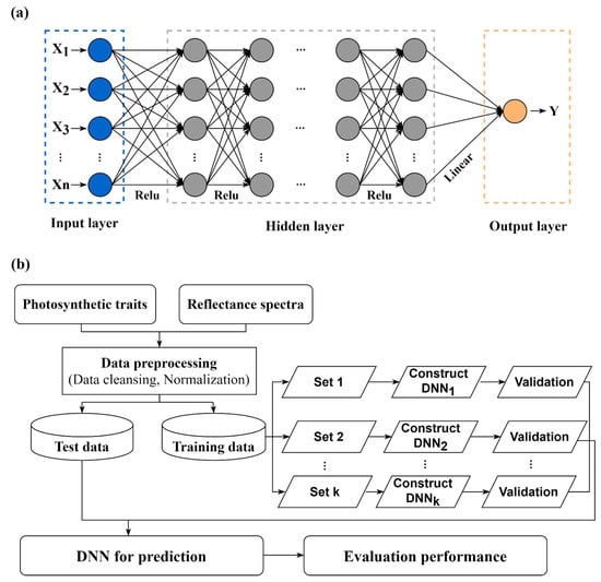 A DNN model is generally composed of an input layer, an output layer, and several hidden layers placed between them, and each layer contains a number of neurons. In this study, leaf reflectance data were considered as predictors of Vcmax and Jmax when constructing the deep neural network. The workflow is illustrated in Figure 2. All predictor variables were normalized prior to building the neural networks. The entire dataset was then randomly divided into training data (75%, randomly chosen) and test data (25%), while the training dataset was further arranged to be in proportion (25%) to the validation data. Specifically, the networks had the following architecture: an input layer, seven hidden layers with 16, 32, 64, 128, 256, 128, and 64 neurons, respectively, and an output layer, with the nodes being fully connected. The rectified linear unit (Relu) activation function was utilized as the activation function in the neurons. The loss and optimization functions selected were the mean square error and the Adam optimizer, respectively. The number of training epochs was defined using early stopping; the networks were trained for 500 epochs, with the patience equal to 20 epochs, to minimize the loss function until the minimum error was achieved to prevent overfitting. Furthermore, dropout [64], which is a regularization technique that randomly and temporarily removes a fixed proportion of different neurons and their respective connections from the network in each training step, was also used to avoid complex co-adaptations on training data, therefore reducing overfitting. The deep neural networks were built and trained with the TensorFlow backend, using the Keras library in RStudio (1.4.1717).