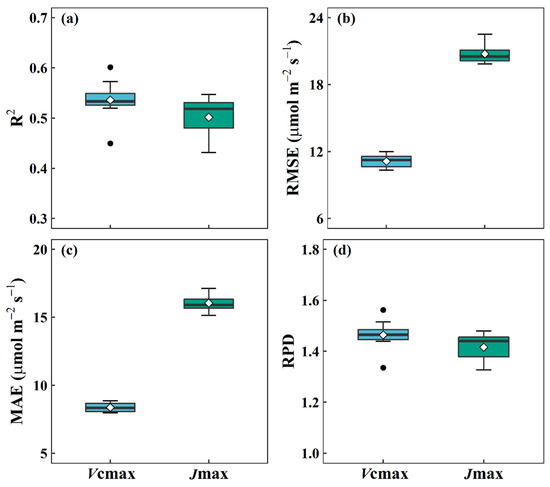 The statistical distributions of the R2 (a), RMSE (b), MAE (c), and RPD (d) values of the ensemble DNN model using a bootstrap bagging approach for predicting the maximum carboxylation rate (Vcmax) and maximum electron transport rate (Jmax) in the Naeba dataset. R2: coefficient of determination; RMSE: root mean square error; MAE: mean absolute error; RPD: ratio of performance to standard deviation.