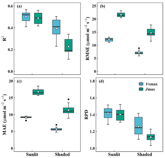 The statistical distributions of R2 (a), RMSE (b), MAE (c), and RPD (d) for predicting the maximum carboxylation rate (Vcmax) and maximum electron transport (Jmax) in sunlit and shaded leaves using the ensemble DNN model. R2: coefficient of determination; RMSE: root mean square error; MAE: mean absolute error; RPD: ratio of performance to standard deviation.