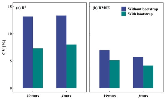 The coefficient of variation (CV) for the coefficient of determination (R2) (a) and root mean square error (RMSE) (b) for predicting the maximum carboxylation rate (Vcmax) and maximum electron transport rate (Jmax) using the DNN model without and with the bootstrap sampling approach.