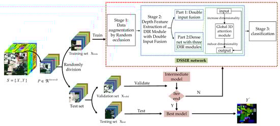 In this paper, we propose a novel HSI classification network, DSSIRNet. DSSIRNet is divided into three stages. The first stage adopts a random erasing strategy for augmentation of the data of the original 3D cube. The two components of the second stage realize effective joint spectral spatial feature extraction. The third stage classifies high-level semantic features. The full combination of the three stages realizes the optimal classification effect of HSI. In addition, this paper studies the random erasing strategy in small spatial blocks, which can expand the data more effectively without adding parameters. In DSSIRNet, an effective feature extraction module, the DIR module, is designed to fully extract image features. This paper also designs a global 3D attention module to fully consider the global context information of spectral and spatial dimension and further improve the classification performance. The experimental results on four datasets prove the effectiveness of DSSIRNet. In the future, we will study a deep learning framework for HSI classification tasks with low parameters and small samples.