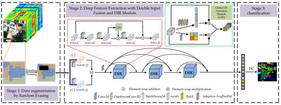 Figure 2 shows the structure of the proposed DSSIRNet. The framework is divided into three stages: data augmentation based on random erasing, deep feature extraction with dual-input fusion and DIR module, and classification. The first stage is designed to solve the problem of limited labeled samples of hyperspectral images. Through block random erasing of training samples, the spatial distribution of the dataset can be fully changed, and the number of available training samples can be effectively increased without parameter increase. In order to improve the robustness of the model, it is necessary to solve the problem of insufficient spectral spatial information extraction of hyperspectral images. The second stage of a deep feature extraction network can solve this problem. The second stage mainly includes two parts: (1) dual-input fusion part; (2) DIR dense connection part. In the second part of this stage, three DIR modules are densely connected to enhance the ability of feature representation. This paper also designs a global 3D attention module in the DIR module to achieve more refined and sufficient global context feature extraction. Finally, the spectral spatial features fully extracted in the second stage are input into the third stage to realize classification.