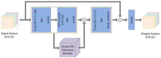 The DIR module designed in this paper is inspired by Mobilenet v3 [] and Efficientnet []. We expand the 2D inverted residual model to 3D inverted residual model. Through a large number of experiments and parameter adjustment, a 3D general module suitable for hyperspectral image classification is designed. Figure 3 shows the schematic diagram of the DIR module.