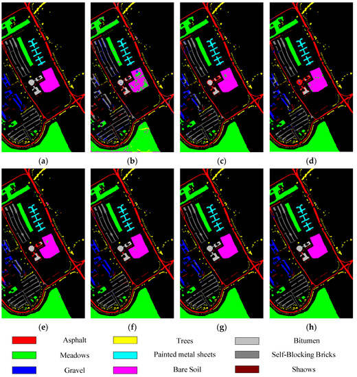 Classification diagrams of UP datasets obtained by seven methods: (a) the ground truth, (b) SVM-RBF, (c) DRCNN, (d) ROhsi, (e) SSAN, (f) SSRN, (g) A2S2K-ResNet, and (h) DSSIRNet.