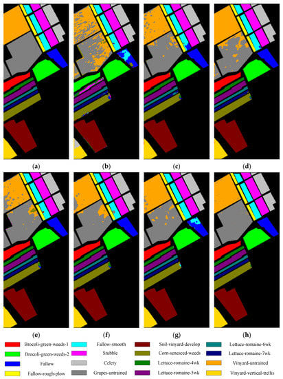 Classification diagrams of SV datasets obtained by seven methods: (a) the ground truth, (b) SVM-RBF, (c) DRCNN, (d) ROhsi, (e) SSAN, (f) SSRN, (g) A2S2K-ResNet, and (h) DSSIRNet.