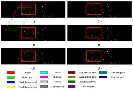 Classification diagrams of BS datasets obtained by seven methods: (a) the ground truth, (b) SVM-RBF, (c) DRCNN, (d) ROhsi, (e) SSAN, (f) SSRN, (g) A2S2K-ResNet, and (h) DSSIRNet.