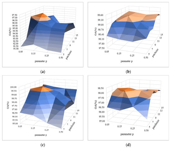 In order to verify the efficiency of random erasing strategy under small spatial blocks, we studied the influence of erasing probability and spatial blocks smaller than 20 × 20 on the classification performance, and showed the comparison results with the surface graph, as shown in Figure 9a–d. It can be seen from Figure 9 that under the same patch size, the OA value reaches the highest value at , and then the OA values of each dataset begin to decrease with the increase of . From the perspective of patch, for the same parameter , with the increase of patch size, the OA value obtains the highest value of each dataset when the patch size is 9. To sum up, for these hyperspectral datasets, appropriate size of image block (i.e., 9 × 9) and erasing probability (i.e., 0.15) are taken, which not only reduces the computational complexity, but also improves the classification accuracy.