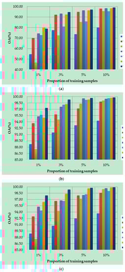 Figure 10a–d show the OAs of all methods on different datasets with different numbers of training samples. Specifically, four datasets are randomly selected from labeled samples, with 1%, 3%, 5%, and 10% training samples in each class. As can be seen from Figure 10, the proposed DSSIRNet method achieves the highest classification accuracy on all four datasets. With the increase of training proportion, the OA values of all methods are improved, and the performance differences between different models are reduced, but the OA value of the proposed method is still the highest. At 1% training samples, compared with other models based on deep learning, ROhsi and SVM_RBF have no advantages. In 5% of the training samples, the OA value of ROhsi on UP and SV increased rapidly, exceeding that of SVM_RBF. Compared with other methods, the proposed DSSIRNet shows the best classification performance in the case of small samples. The reason is that it adopts an effective data augmentation strategy and the DIR module to realize effective feature extraction, which also proves that DSSIRNet has more advantages in the case of small datasets.