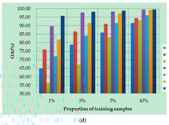 Classification results on four datasets under different training sample proportions: (a) IN, (b) UP, (c) SV, and (d) BS.