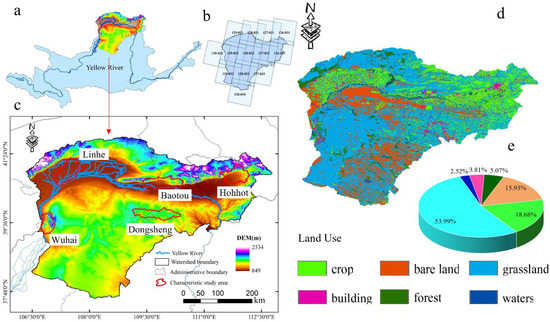 (a) Location map, (b) Landsat images, (c) elevation and cities, (d) land use, and (e) land area of the Yellow River, Inner Mongolia section.