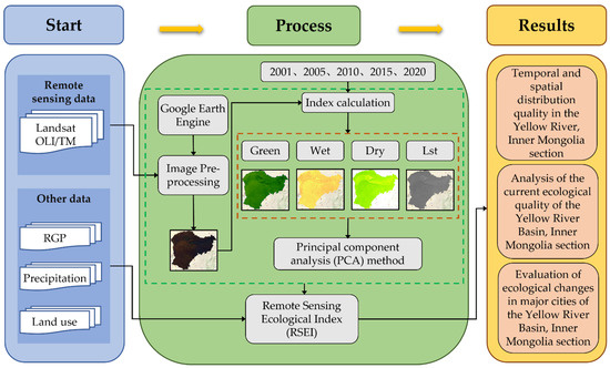 RSEI is constructed on the basis of a principal component transformation, specifically elaborated by concentrating the main information provided by the four indices of Green, Dry, Wet, and Lst in the first principal components in order to be able to describe them within a single indicator. The method integrates information closely related to these four indices, which is advantageous when constructing RSEI. The higher the RSEI value, the better the ecological condition. We have divided the RSEI into five ecological quality classes: bad (0.00–0.20), poor (0.20–0.40), average (0.40–0.60), good (0.60–0.80), and excellent (0.80–1.00) [21,22,23]. Figure 2 shows the sequence of the process of calculating the ecological quality of the Yellow River Basin in the Inner Mongolia section using the Google Earth Engine.
