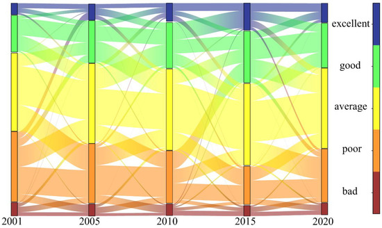 In this study, the area conversion matrix of different levels of RSEI for five time periods were combined with Sankey plots to assess and analyze changes in ecological and environmental quality of the study area between 2001 to 2020 (Figure 4). As shown below, the ecological environment of the basin has improved to varying degrees. In particular, the average, good, and excellent lines in RSEI accounted for 10.5% of net transfers in 2015. Although RSEI scores decreased from 2015 to 2020, they show an overall gradual improvement of the ecosystem.
