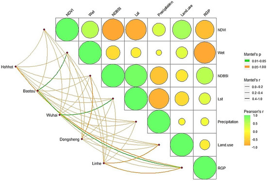 In order to explore which factors influence quality of the cities within the study area, Mantel and Pearson correlation analysis was conducted by combining R language for RSEI, NDVI, Wet, NDBSI, Lst, Precipitation, Land Use, and Regional Gross Product (RGP) for the Hohhot, Baotou, Wuhai, Dongsheng, and Linhe cities [12].