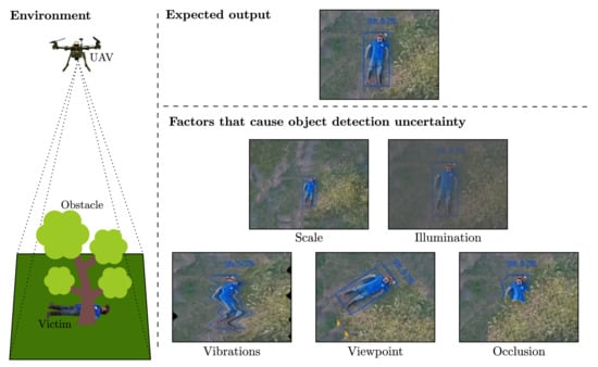 Real-world and time-critical UAV applications are full of uncertainties. As shown in Figure 1, uncertainty comes from uncontrolled external factors, such as unknown environment conditions, strong wind gusts, dynamic obstacles, suboptimal survey altitude, and partial observability. Research has demonstrated that applied theory on decision making using partially observable Markov decision processes (POMDPs) can increase cognition capabilities in UAVs for autonomous path planning under uncertainty [,,]. UAV frameworks for real-time target finding and tracking in cluttered indoor environments under uncertainty [,] have been developed by using augmented belief trees (ABT) [], an online POMDP solver that computes and updates motion policies in real time. Similarly, POMDPs have also been used to solve multi-objective UAV tasks, such as collision avoidance, path planning, and multiple target tracking [,]. In the SAR domain, autonomous navigation in humanitarian relief operations have also been tested using POMDPs, with most of the implementations achieving experimental results only in simulation [,]. A recent research work towards real-world tests shows a UAV motion planner implementation using the SARSOP POMDP solver [] onboard a small UAV (UAVs with a maximum take-off weight (MTOW) of 13.5 kg []). However, the system was only validated using trivial targets and not with humanoid-shaped mannequins [].