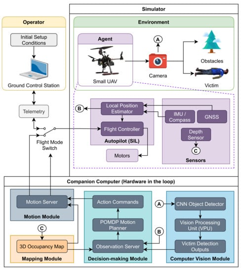 The proposed system architecture categorises its modules into two primary categories, namely the simulator and the companion computer (operating under HIL). The simulator is comprised by items within in the simulated environment including models of the UAV body frame, payloads (i.e., cameras), the victim and relevant obstacles. In addition, the simulator contains plugins to add the UAV’s autopilot in the software in the Loop (SIL) mode, and relevant peripheral sensors. The readings of these simulated sensors are used by the autopilot to run its local position estimator based on an extended Kalman filter (EKF). The second category contains the system modules that can be run onboard a UAV’s companion computer using HIL, namely, the Computer vision module, decision-making module, mapping module, and motion module. Specific implementations to enable SIL and HIL are covered in detail in Section 4.