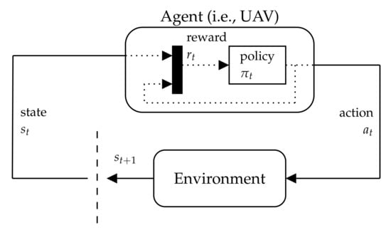 Each change of state (or action–state chain) is quantified with a reward r. By giving numerical values to every action–state chain, the behaviour of the UAV can be influenced by seeking the highest possible reward when specific desired states are reached (e.g., locating a victim without colliding with nearby obstacles). Simultaneously, action–state combinations that lead to undesirable future states (e.g., colliding with nearby obstacles, or flying beyond the survey geofence) could be quantified with a penalty (or negative reward). Therefore, these problems can be solved by finding the optimal sequential set of actions that a UAV should take to obtain the highest possible accumulated reward as quick as possible [].