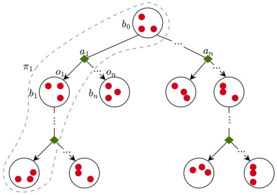 A POMDP solver starts planning from an initial belief , which is usually generated using the initial conditions (and assumptions) of the flight mission. When an observation is made, the belief distribution is subsequently updated. The motion policy of the UAV is represented by mapping belief states to actions . An illustration of a belief tree and motion policy in POMDPs is shown in Figure 4.