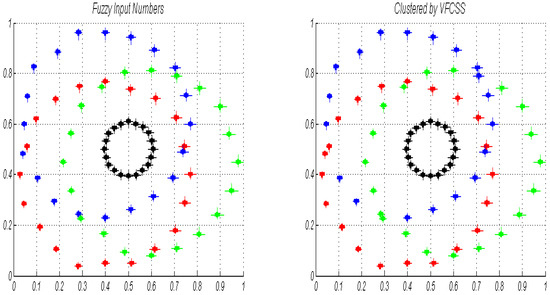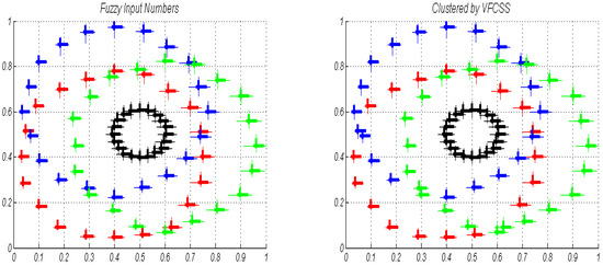 The noise added to crisp numbers has a max absolute of 0.1 times the corresponding circle radius. This is for performance evaluation of the proposed VFCSS performance versus noise. In demonstration of LR-type fuzzy numbers in simulation result figures, the distance between is in bold while are demonstrated normally. To evaluate the VFCSS clustering accuracy we use a Confusion Matrix (CM). A CM is a matrix, where is the number of numbers from the th class that are clustered as the th cluster. Furthermore, in the resulting membership grade matrix (), it is assumed any input number belongs to a cluster that has the maximum membership of it. In this paper, VFCSS is applied to analyzed numbers in various states and results are reported as follows.
