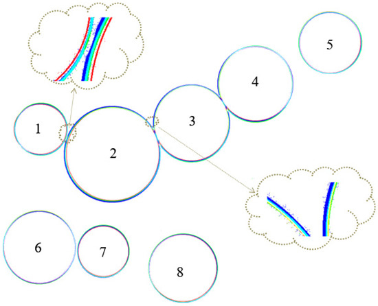 If we demonstrate the extracted circles from images (a), (b) and (c) of Figure 8 by red, green and blue color respectively, the resulting circles are as in Figure 9. It can be observed, some of the resulting circles are non-overlapping while in some areas, as in the worst case, all 3 circles are in contact and are specified by red, green, and blue colors. In some area, two colors from RGB overlap and combined and cyan, yellow, and pink colors result. Finally, in rare cases, by complete overlapping of the circles, white color results. For this case, the resulting radius by conventional FCSS is reported in Table 12. We can observe various values for each circle are obtained by conventional FCSS (in an un-regular manner, it means the resulting radius from the first image in some cases is the min value, in other cases is the max value, etc.). This ambiguity will be increased, by increasing the number of available images. Furthermore, computational complexity will be increased by growing the number of available images as well. For this reason, FCSS must be applied on image circles separately.