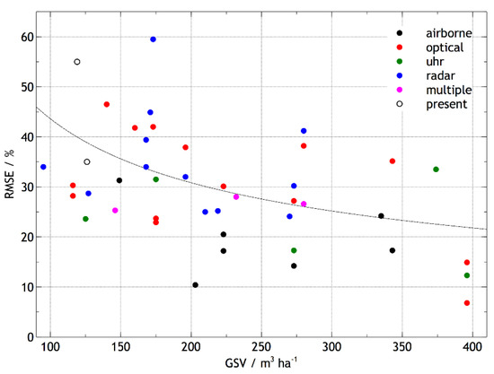 Figure 1 attempts to give a simple overview of the current situation regarding remote sensing estimation of GSV. It has been compiled from quantitative data abstracted from many publications [13,14,16,21,22,23,25,27,32,33,37,40,47,48,50,56,57,58,59,60]. As Figure 1 shows, typical accuracies for spaceborne methods are approximately 20 to 40% RMSE, becoming somewhat poorer at lower values of GSV.