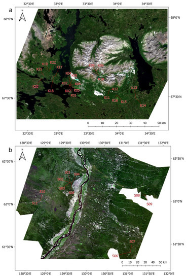 Figure 3. Location of field plots in the Khibiny (a) and Sakha (b) study areas. The backgrounds are true-colour (432) composites of the summer Sentinel-2 images identified in Table 1.