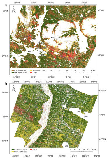 Figure 5. Generalised forest-cover map of the study areas. Non-forest areas are masked out. (a) Khibiny; (b) Sakha. Site locations are identified.