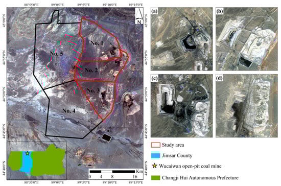 Location of Wucaiwan open-pit mine in China. The four right optical images are from Google Earth: (a) No. 1 open-pit coal mine; (b) first mining area of No. 2 open-pit coal mine; (c) the second mining area of No. 2 open-pit coal mine, and (d) No. 3 open-pit coal mine.