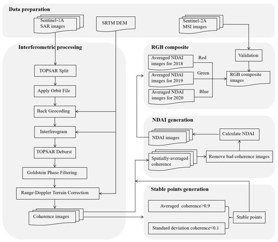 In this paper, we use SNAP [42] software to perform interferometric processing on the 92 available SAR images with a 12-day temporal baseline and generate 91 coherence images. In the processing, all SAR images are cropped to reduce the processing time. Sentinel-1A precise orbit files are also downloaded by the apply-orbit-file tool to improve the geocoding and subsequent SAR processing results. The orbit file and external SRTM DEM data are introduced to coregister the master and slave images by the back-geocoding operator. The interferogram and coherence images are then generated by calculating the phase difference and cross-correlation coefficient in the interferogram step. The flat-earth and topographic phases are then removed using the SRTM DEM data. To reduce the speckle noise, Goldstein phase filtering is used for all coherence images. Finally, to superimpose the coherence and optical images for further analysis, the terrain correction is applied and orthorectified coherence images are generated. Figure 2 shows the entire workflow of the proposed method.