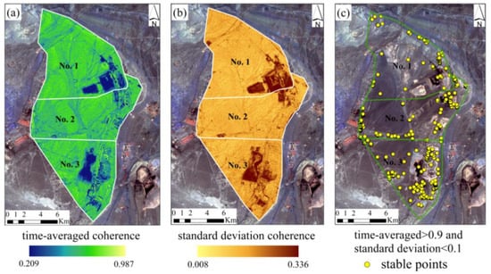 In this study, the stable points acquired from the time-averaged and standard deviation of the coherence images are used to analyze and remove the decorrelation noise. The NDAI mainly relies on stable points that are effective at detecting temporal decorrelation to eliminate decorrelation noise in the target area. The decorrelation noise due to weather conditions such as rain and snow can be directly removed by excluding coherence images with spatially averaged coherence values of the stable points that are less than 0.9. This requires stable points which are close enough to the target region to have the same weather conditions. The NDAI as defined in Equation (3) is calculated to reduce the decorrelation noise caused by the spatial baselines as shown in Figure 6. Although the local topography-induced decorrelation is partly mitigated by averaging the coherence of the stable points distributed throughout the mine area, its corresponding induced errors are still present [51]. The distortion caused, in cases where the SAR look-angle is less than the back-slope slope of the terrain and is not illuminated by the radar beam, is referred to as the shadow [52]. Shadow area is shown in the SAR image as dark regions and has a high NDAI and can confuse active mining areas [53]. For example, the first mining area of the No. 2 open-pit coal mine stopped mining in November 2015, but still possesses several white color patterns that represent a consistently active status as shown in Figure 9a. We speculate that this is most likely due to the high-value NDAI caused by shadows. However, it is difficult for us to distinguish between the shadow area and the mining activity area in No. 1 and 3 open-pit coal mines that had been active. If the study area has both ascending and descending track data, we expect that combining them eliminates the shadow areas.