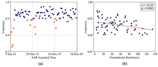 The process of analyzing decorrelation using the spatially averaged coherence values of stable points obtained based on coherence images with 12-day intervals: (a) The relationship between the spatially averaged coherence values of the stable points and the SAR images acquisition time as a function. Coherence images represented by yellow points are excluded from further analysis. (b) Pearson’s correlation coefficient and linear regression analysis of the relationship of the spatially averaged coherence values of the stable points and the absolute values of perpendicular baseline.