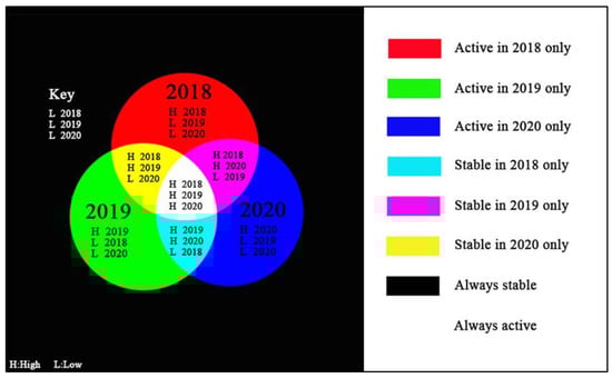 The RGB composite technique is applied to the annually-averaged NDVI to visualize the interannual variation of mining activities in the mine areas between 2018 and 2020. Figure 5 displays the RGB composite scheme and the meaning of each color. Each annually-averaged NDVI image corresponds to a color channel, i.e., 2018 for the red channel, 2019 for the green channel, and 2020 for the blue channel. Red, green and blue indicates the mining areas that were active only in 2018, 2019, and 2020, respectively. In this setting, cyan, magenta, and yellow represent the mining areas that were stable only in 2018, 2019, and 2020, respectively, but were active in the other two years. The white color also means that the mining areas had always been active, whereas the black color indicates that the mining areas had always been stable during the above three years.
