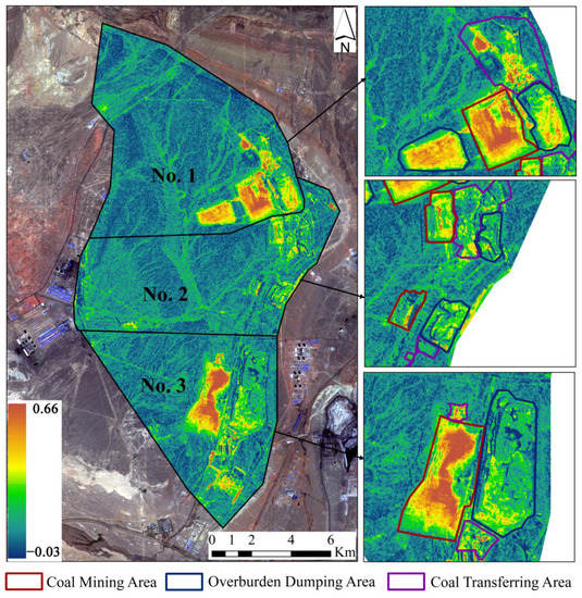As seen in Figure 6, due to the mining activities, the NDAI values of the open-pit coal mines are significantly higher than in other surrounding areas. Table 2 also presents the proportion of the pixels with NDAI >= 0.2 to the total pixels in each area in the coal mining areas, overburden dumping areas and coal transferring areas of No. 1, 2, and 3 open-pit coal mines. In terms of coal mining areas, the proportion of NDAIs greater than or equal to 0.2 in the mining areas of No. 1 and 3 open-pit coal mines are significantly higher than that of the No. 2 (No. 1: 90.3%, No. 2: 46.1%, No. 3: 76.3%). This indicates that No. 1 and 3 open-pit coal mines are more active and produced more coal than No. 2 during the three years.