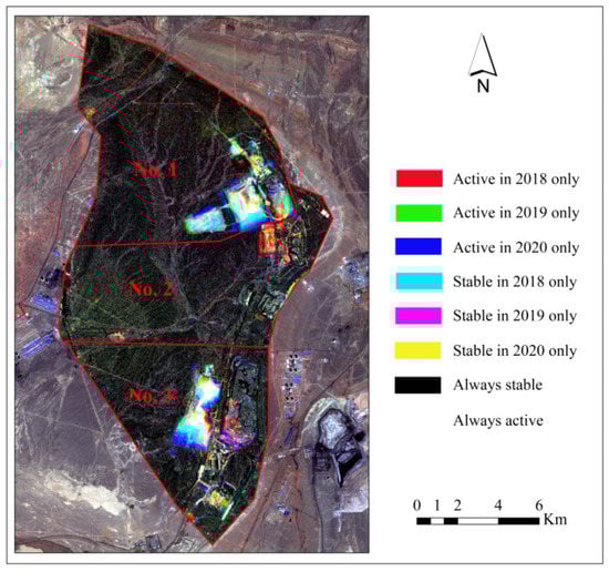 The interannual variation of the mining activity map over the No. 3 open-pit coal mine is shown in Figure 11. It is seen in Figure 11a that there are large areas of white pixels distributed from south to north throughout the coal mining area. This indicates that the area has been always active from 2018 to 2020. In the southern half of the coal mining area, the color patterns from pit floor to pit mouth are white (i.e., always active), cyan (i.e., active only in 2019 and 2020), and blue (i.e., active only in 2020). These indicate that this mine has been gradually being excavated southward from 2018 to 2020. According to Figure 11c,e, the process of pit floor and pit mouth moving southward shows that our experimental results are correct. In the northern half of the coal mining area, the pit benches that already existed before 2018 were also covered by white, cyan, and blue pixels, indicating that the area had undergone drastic changes over time. Intense activities at the pit bench are usually caused by the landfills. As shown in Figure 11b, the area was still a stable pit bench on 4 August 2018 and 21 May 2019; whereas, it had been landfilled with the overburden accumulated to the south on 9 June 2020. This is consistent with the results reported by the NDAI values. The overburden dumping area is dominated by black pixels that are always stable, and only a small part of the south side has an active color pattern. The above analysis results also show that our previous speculation is correct. The mine area mainly adopts the mining method of south digging and north filling.