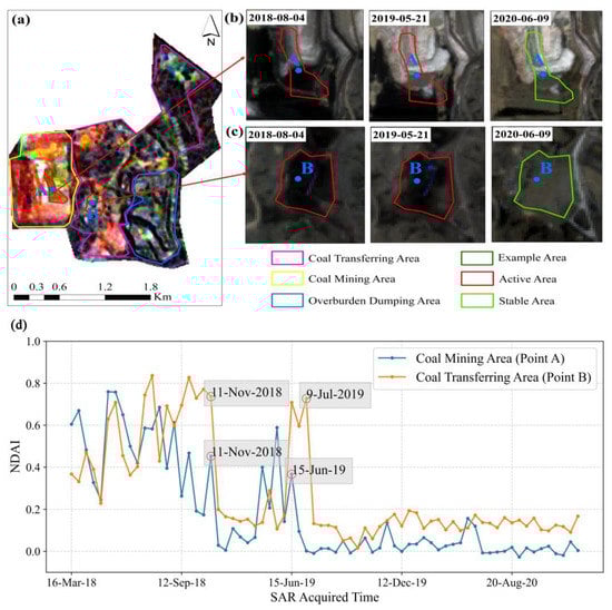 Interannual changes of mining activity maps over the second mining area of No. 2 open-pit coal mine: (a) The RGB composite map of the annually-averaged NDAI images; (b,c) Sentinel-2A MSI images which were captured 4 August 2018, 21 May 2019, and 9 June 2020, respectively. Two example areas from the coal mining and transferring areas are selected to validate the reliability of the using the optical images; (d) graph of the NDAI time-series with 12-day intervals for point A of the coal mining area and point B of the coal transferring area, showing specific date of surface activity.