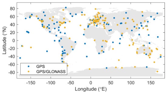 In this study, the PWV derived from the gridded spaceborne sensors and the IWV products are interpolated to the positions of 320 globally distributed IGS stations, for which the ZWDs were estimated within the IGS repro2 with three types of solutions, namely the GPS, the GLONASS, and the combined GPS/GLONASS (“Combined” for short) solutions. All of the stations could receive GPS signals, and 154 of them could receive both GPS and GLONASS signals, as shown in Figure 1.