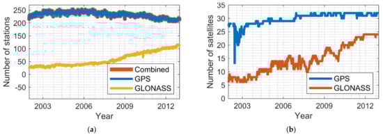 Figure 2a shows the number of stations (weekly averaged) used in the three abovementioned solution types. For the GPS-based and the Combined solutions, there were approximately 220~250 stations used per day. For the GLONASS solutions, the station number has gradually increased from 30 in 2003 to nearly 120 in 2012. The number of GPS satellites is around 30 in general, while the GLONASS satellites reached 19 in 2009 and was around 24 after 2011, as shown in Figure 2b (weekly averaged).