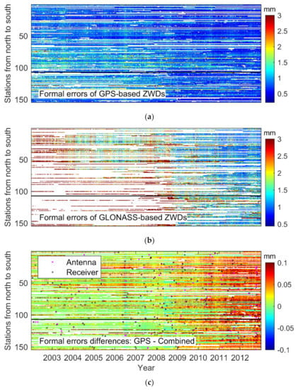 Time series of 154 global stations that can receive dual-system signals. (a) The Global Positioning System (GPS)-based formal errors for the Zenith Wet Delay (ZWD). (b) The Global Navigation Satellite System (GLONASS)-based formal errors for the ZWDs. (c) The formal error differences between the GPS-based and the Combined-based ZWDs. (Stations are sorted by latitude from north to south. The black horizontal line is the dividing line between the northern and southern hemispheres. Black and pink squares are the receiver and antenna replacement marks, respectively).