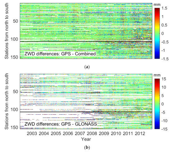 Time series of 154 global stations that can receive dual-system signals. (a) The ZWD differences between the GPS-based and the Combined solutions, and (b) between the GPS- and the GLONASS-based solutions.