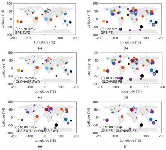 Figure 6 shows the global distribution of the ZWDs, their formal errors, the ZWD differences, and the formal error differences between the GPS- and the GLONASS-based solutions. The size of the circles represents the magnitude of the values. Different colors represent different antenna brands. For comparison purpose, all values are normalized in each subplot.