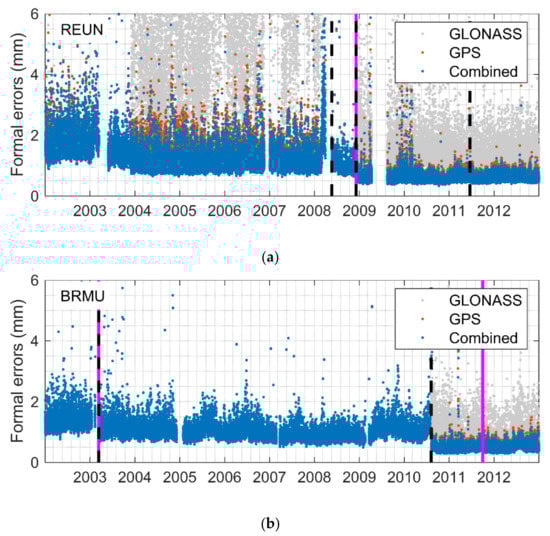Figure 7 shows the formal errors of the station REUN (Le Tampon, France) and the station BRMU (Town of St. George’s, UK). Before 2011, the receiver or an antenna change leads to noticeable improvements in the formal errors. After 2011, the hardware equipment no longer causes such large jumps as before. The fundamental reason is still the amount of measurement. During the development of the GNSS constellations, new equipment often means capability to track more signals.