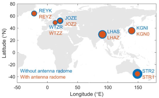 The selected six pairs of co-located stations are only characterized by the antenna radome, with different types of antenna brands or series. The locations of the six pairs of co-located stations are shown in Figure 8, and the details of these stations are listed in Table 1.
