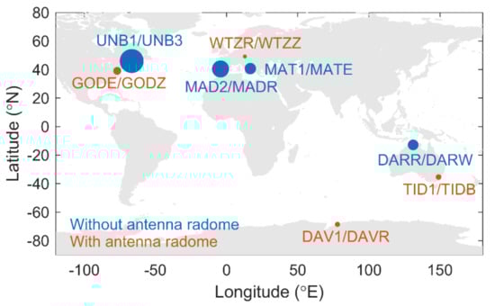 The locations and the details of these eight pairs of co-located stations are shown in Figure 9 and Table 2, respectively. There are four pairs having the antenna radomes (red circles in Figure 9) and the others are not (blue circles in Figure 9). The absolute formal error differences are listed in the last column of Table 2, and the size of the circles in Figure 9 represents the mean value of the absolute formal error differences. It can be seen that the four pairs with antenna radomes have smaller formal error differences than those without radomes.
