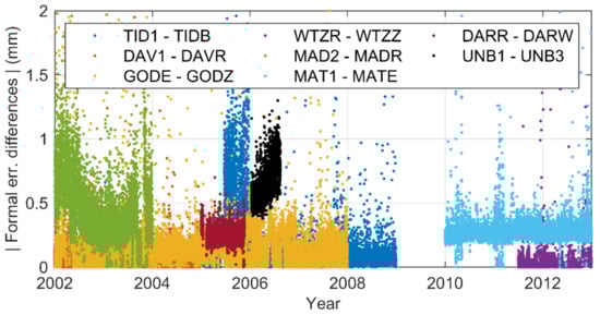 Time series of formal error differences for eight pairs of co-located stations.