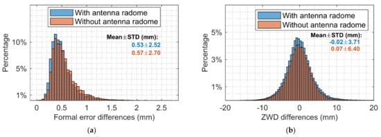 Finally, larger samples containing 86 stations are analyzed considering the antenna radome issue. There is no change in the hardware equipment during the test period for these stations. Among them, 36 stations have antenna radomes. The histogram of the differences is shown in Figure 11. After removing outliers according to the three-sigma rule, the statistical results are listed in Table 3. It can be seen that for both formal error differences and the ZWD differences, those with antenna radomes show better performance.